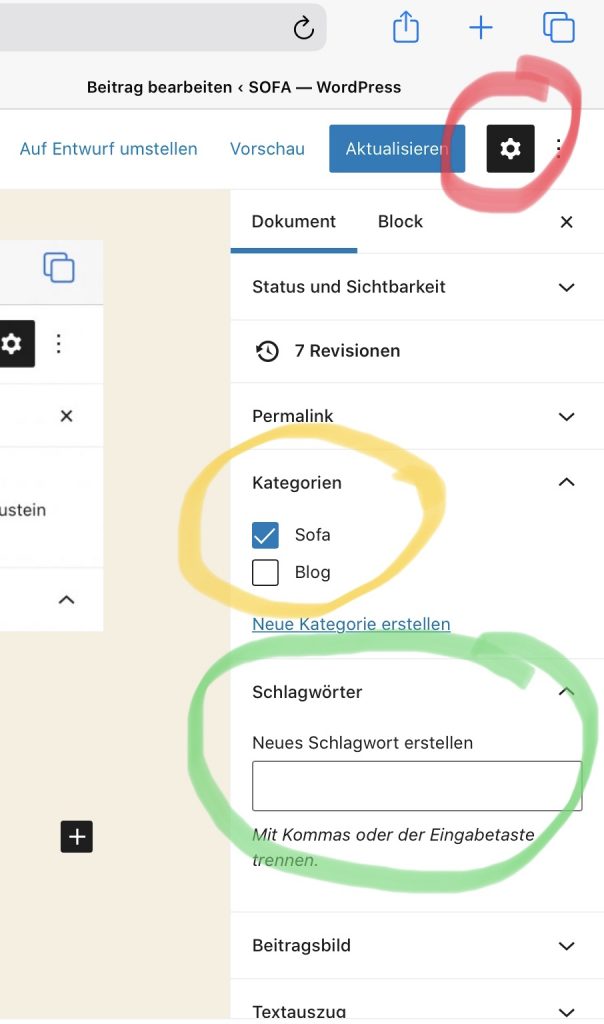 Stelle ein (roter Kreis), ob dein Beitrag auf das Sofa oder in den Blog gehört (gelber Kreis). Hier soll bei fachspezifischen Beiträgen auch das Fach markiert werden. Beiträge sind besser wiederzufinden, wenn Schlagworte angegeben werden (grüner Kreis). Diese erscheinen auf der Startseite in der Schlagwortwolke.