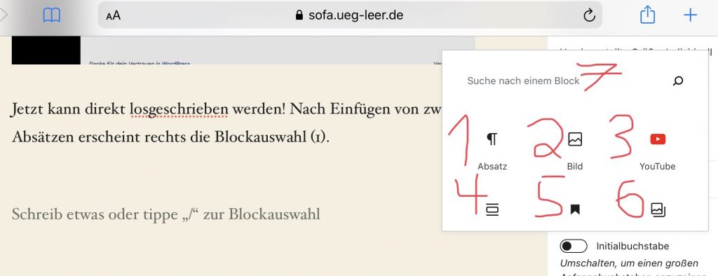 Die Blockauswahl ermöglich die Rückkehr zum normalen Schreiben (1), das Einfügen von Bildern (2), Videolinks (3), Zitaten (4), Überschriften (5) und Bildergalerien (6). Weitere Gestaltungsmöglichkeiten, wie z.B. das Einfügen von Links, finden sich im Suchfeld (7).