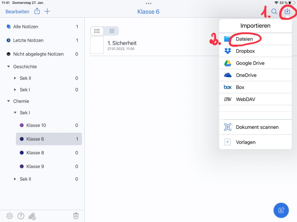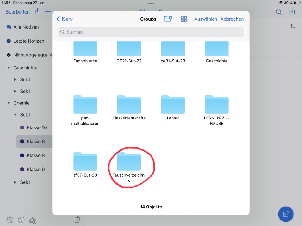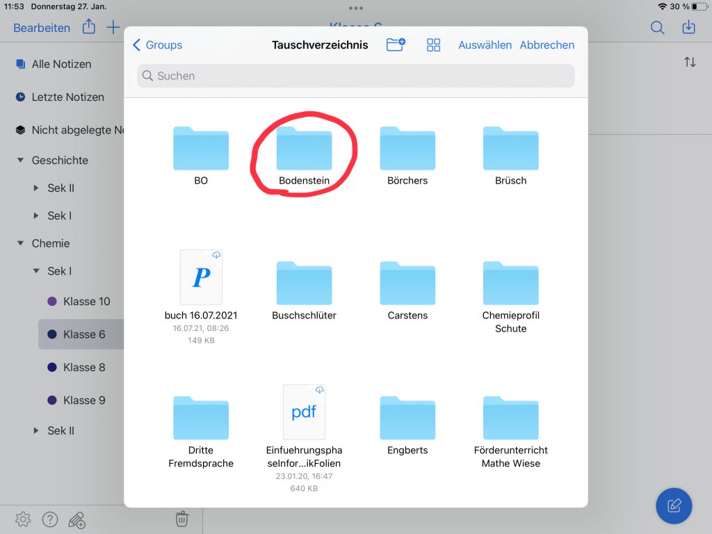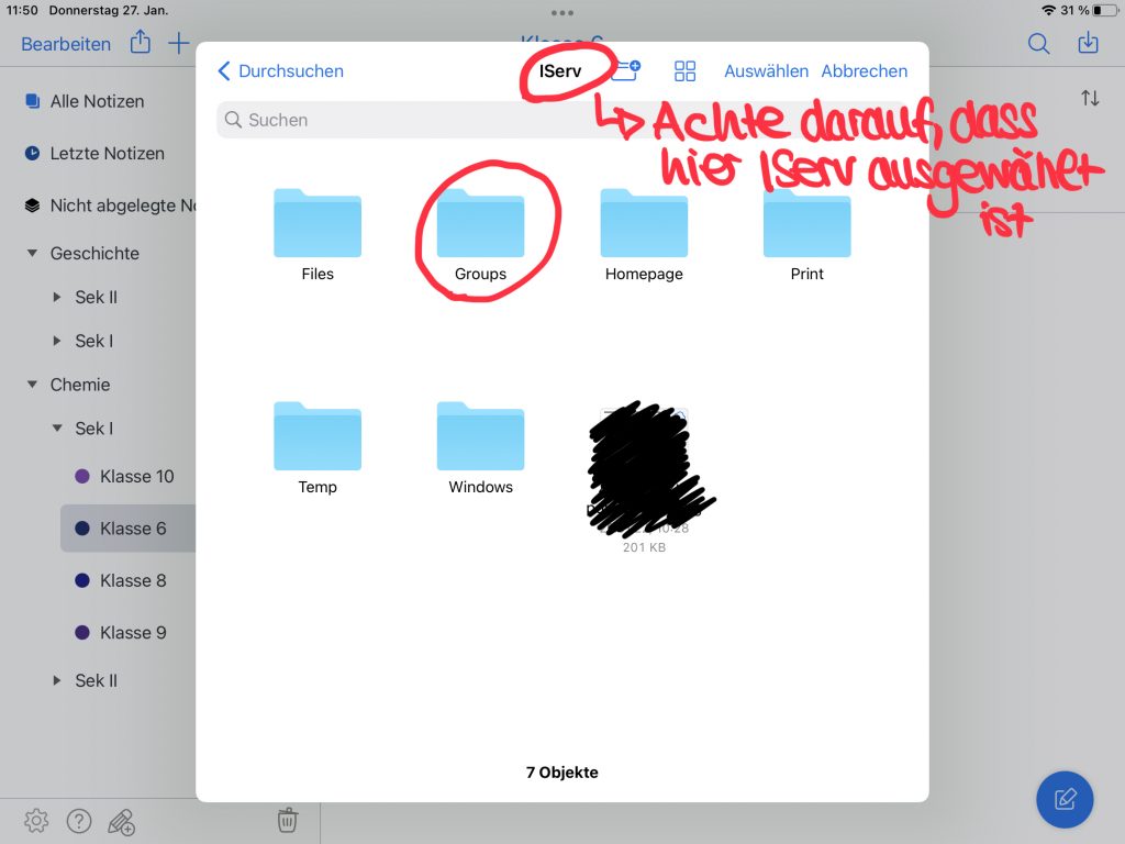 Schritt 1: Tippe oben rechts auf das Symbol „Rechteck mit Pfeil“ und wähle „Dateien“ aus.Schritt 2: Du gelangst so in deine Iserv-Dateien. Wähle „Groups“<<„Tauschverzeichnis“<<„Name der Lehrkraft“ und suche die benötigte Datei.Schritt 3: Nachdem du die benötigte Datei ausgewählt hast, öffnet sich ein Fenster. Hier kannst du auswählen, ob du eine Notiz erstellen oder zu einer anderen Notiz hinzufügen willst. Es wird automatisch eine leere Seite nach Hinzufügen eines Arbeitsblattes oder Ausfüllen einer Seite ergänzt.Schritt 4: In der oberen Leiste kannst du zwischen verschiedenen Werkzeugen wählen und die Notizen bearbeiten.